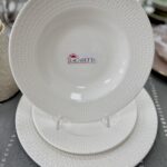 | Content | Portelan cu bord argintiu | Diam 33cm | Diam 29cm x h24cm | Set de 18 piese, farfurii din porțelan albe cu model | ||